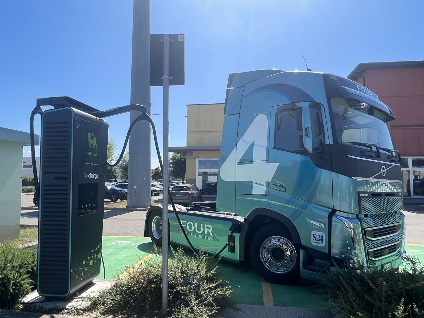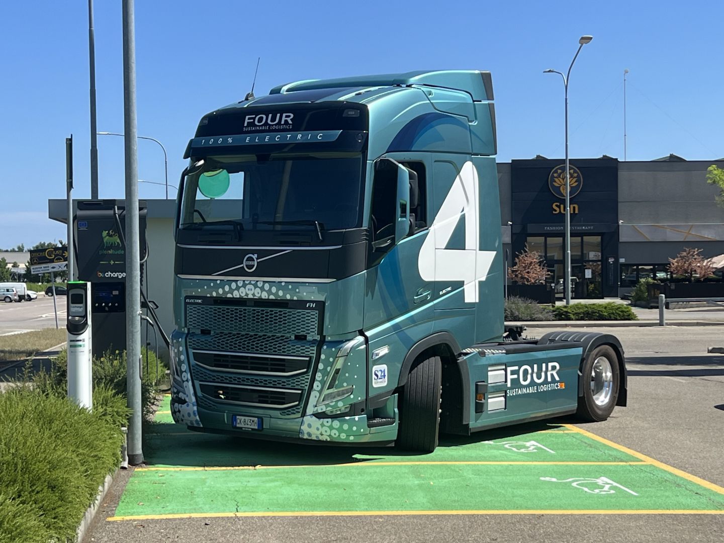 Queste caratteristiche contribuiscono a rendere particolarmente efficiente l’impiego del semirimorchio Burgers non solo con camion alimentati a diesel o bio-carburanti, ma anche con trattori elettrici, creando così un abbinamento inedito e ultra-sostenibile per le strade italiane e per l’intero sistema europeo. FOUR si è affidato a Volvo Trucks e all’ammiraglia FH Electric (eletta “International Truck of the Year 2024”). Il modello protagonista del progetto è il trattore due assi (4x2) in grado di erogare una potenza di 490 kW in continuo, configurato con la cabina Globetrotter e interni black edition e massa totale a terra della combinazione pari a 44 tonnellate. Il veicolo, ideale per il trasporto di grandi volumi di alimenti, beni di consumo e forniture industriali, dispone di 6 batterie poste a destra e sinistra dei longheroni per una capacità nominale totale di 540 kWh.
